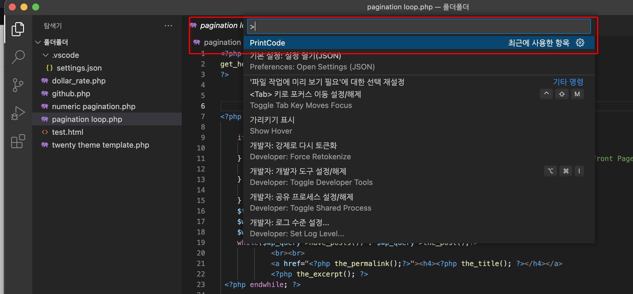 ② 패널에 나타난 검색창에 printcode를 넣는다