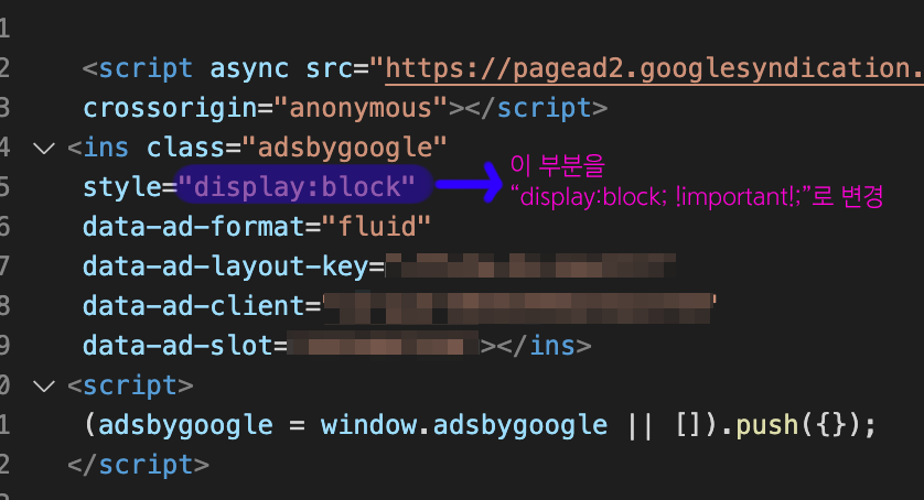 그런데 어떤 코드든 무조건 style="display:block"이라는 코드를 포함하고 있고 이 부분만 살짝 수정해 주면 모바일에서 인피드 광고를 정상적으로 누출시킬 수 있으니 당황하지 말자
