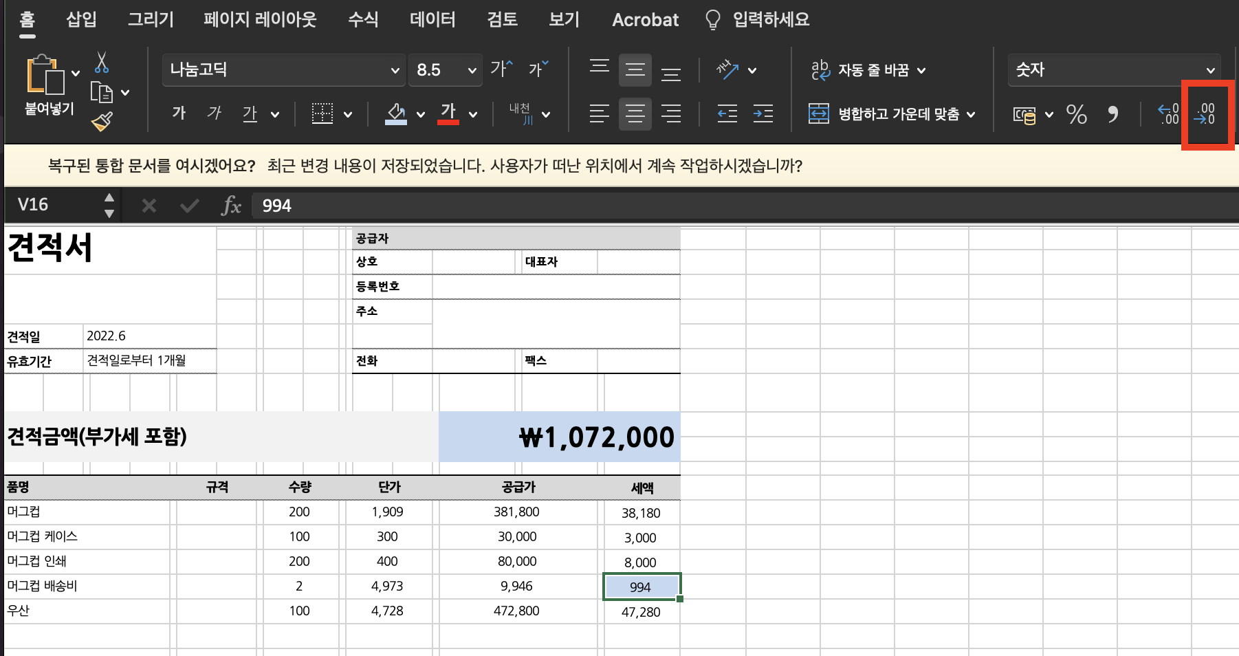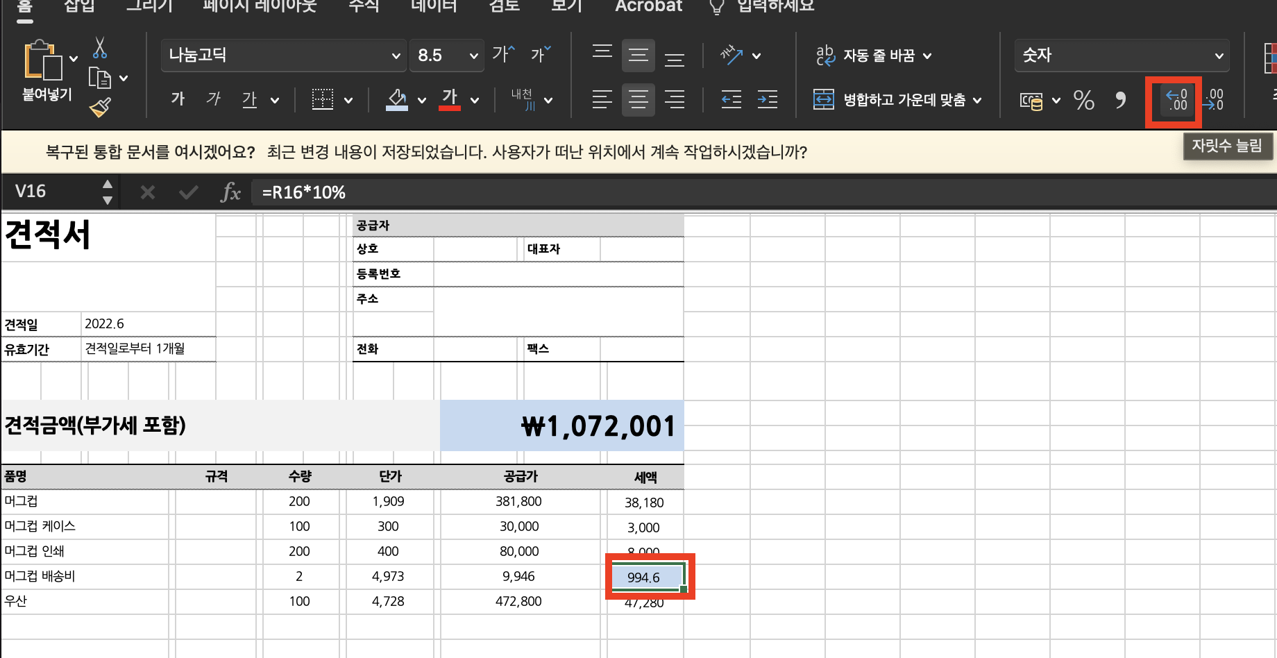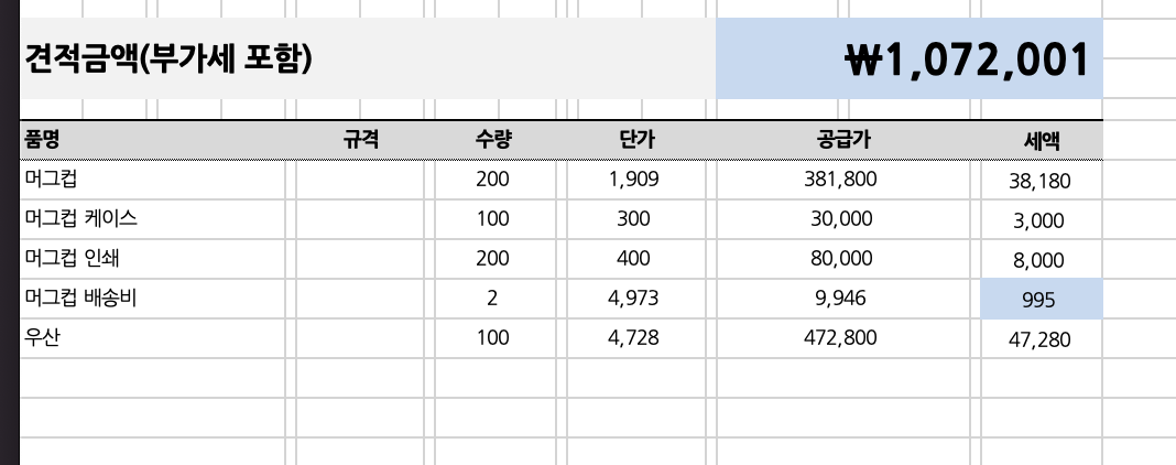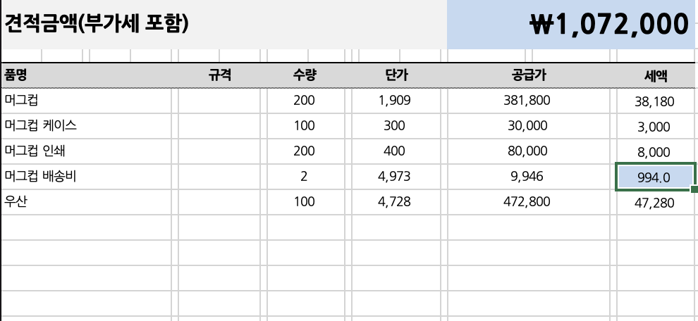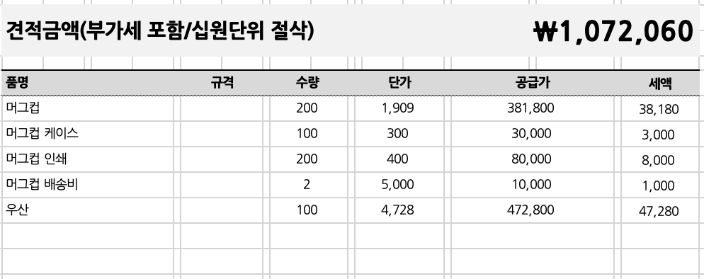 견적서를 작성하다 보면 아래처럼 끝자리가 맞아 떨어지지 않는 경우가 있다