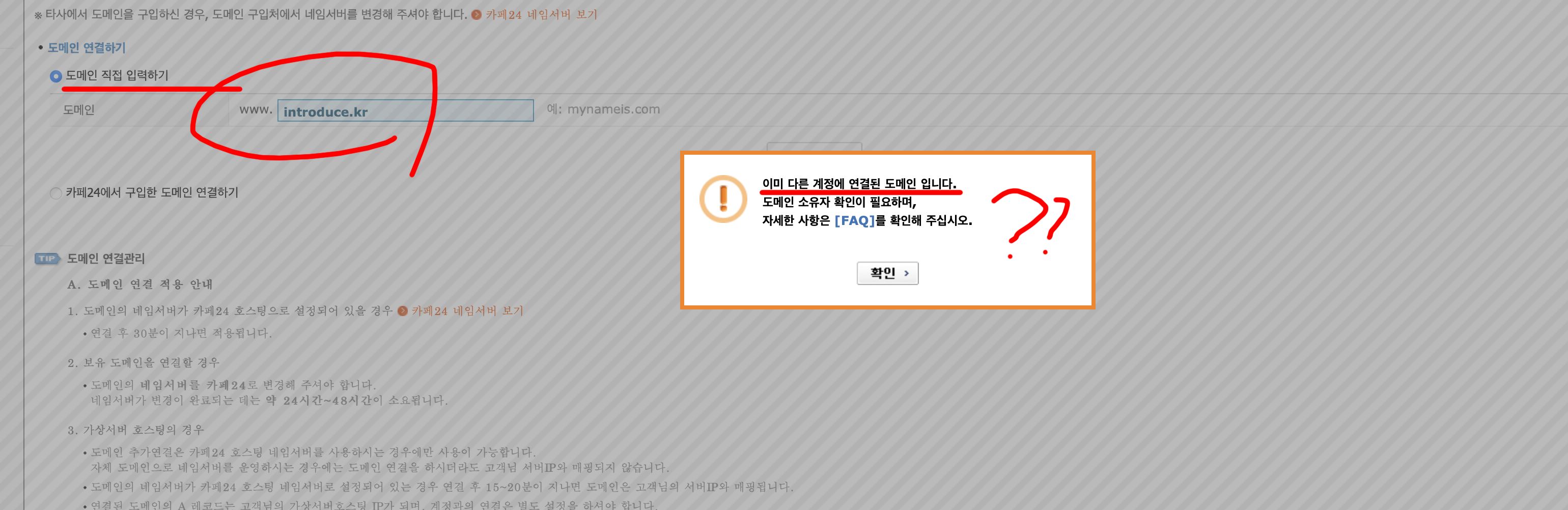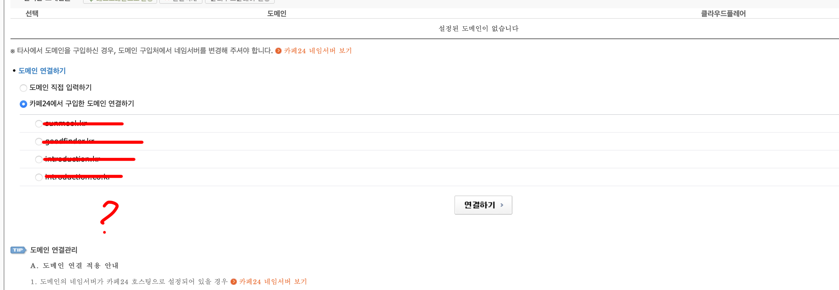 그런데 막상 도메인을 연결하려고 까페24에서 구입한 도메인 연결하기를 누르니
