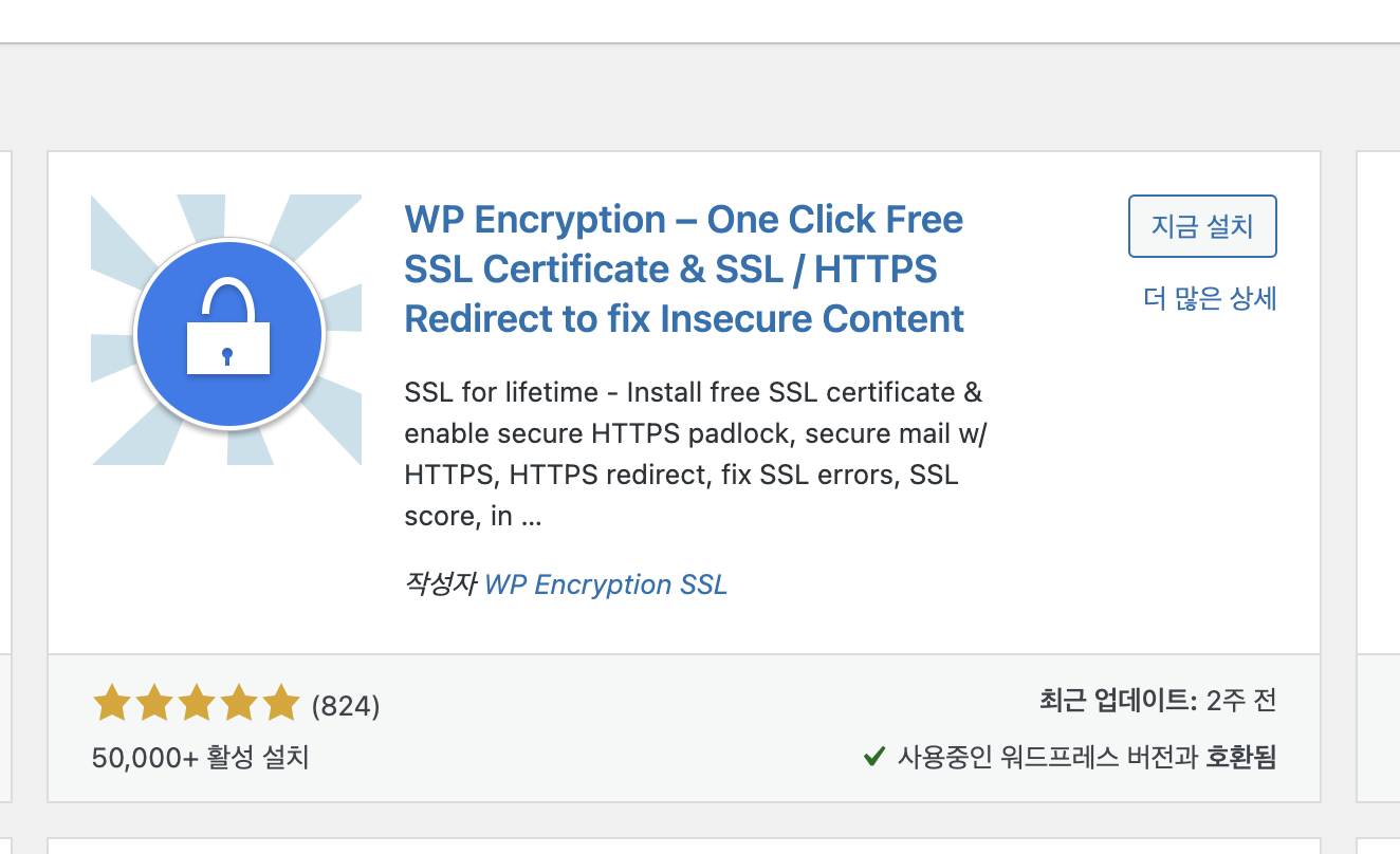 플러그인 추가하기에서 WP Encryption이라고 치면 이런 플러그인이 뜬다