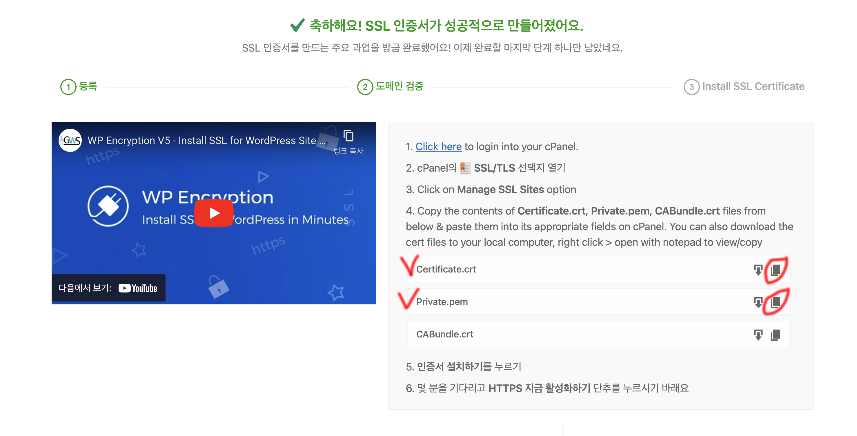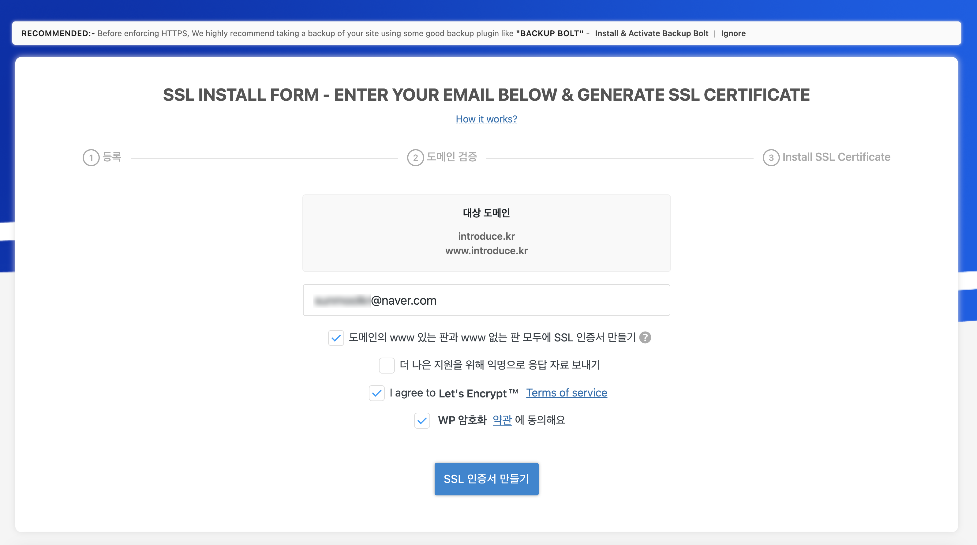 대상 도메인은 자동으로 잡히는 것 같고 이메일 주소를 넣은 후 내가 체크해 놓은 3가지 항목만 정확하게 체크한 후 SSL 인증서 만들기를 클릭하자