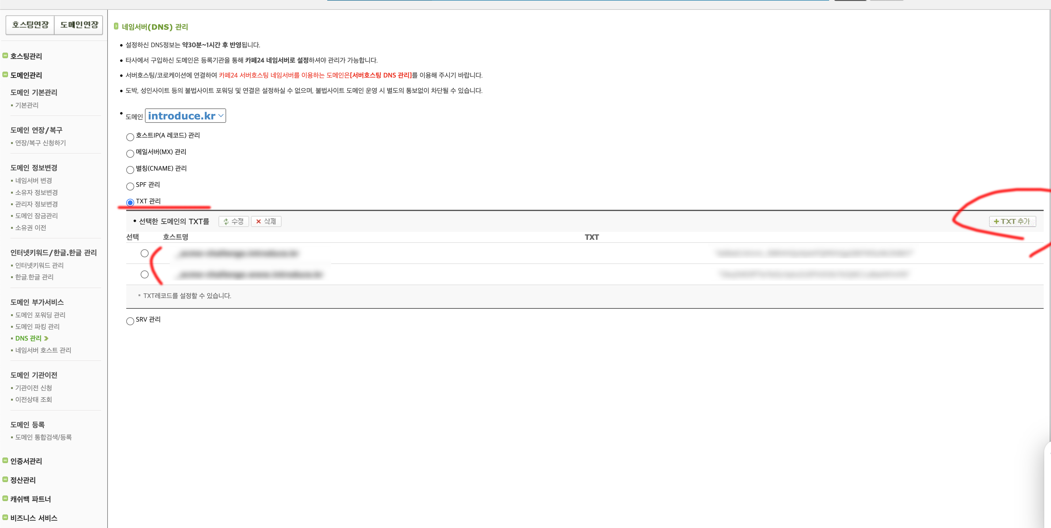 DNS관리에서 TXT관리를 체크한 다음 TXT추가 버튼을 눌러