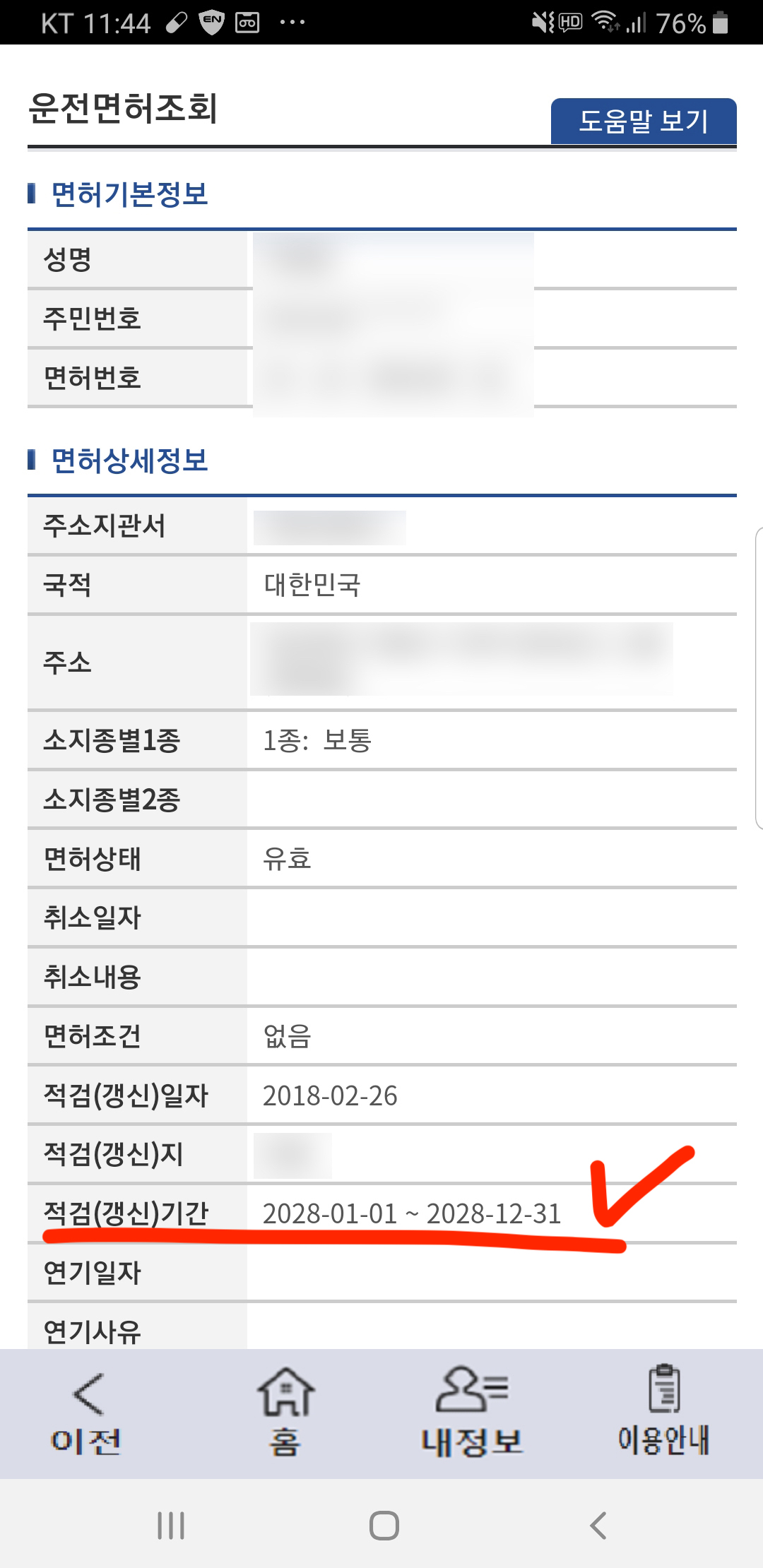 본인인증을 마치고 나면 내 면허와 관련된 여러가지 항목들을 보여주는데 하단에 적검(갱신)기간을 보면 운전면허를 갱신해야 할 날짜를 확인할 수 있다