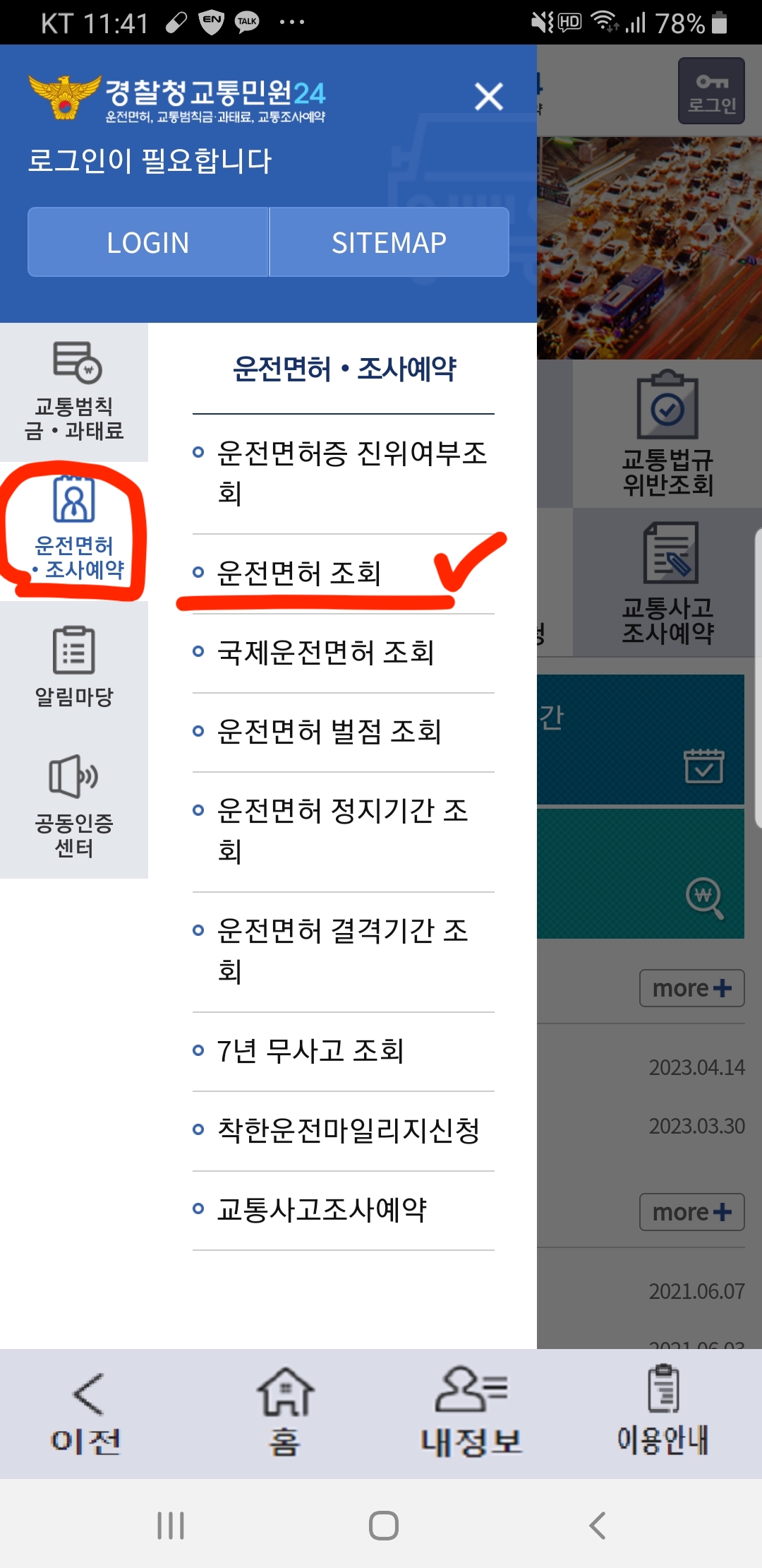 2. 좌측 햄버거 메뉴 클릭 - 운전면허.조사예약 - 운전면허 조회