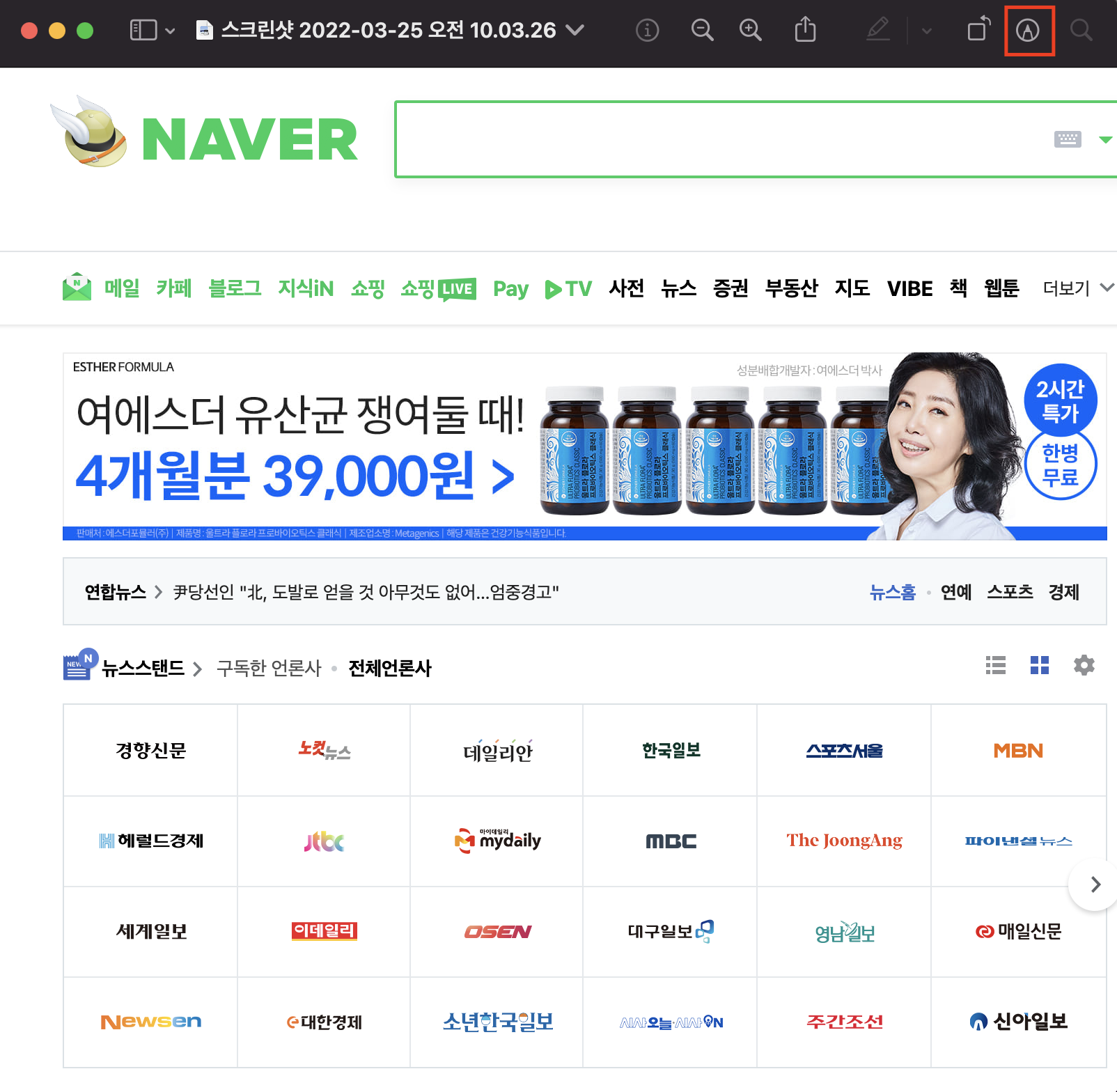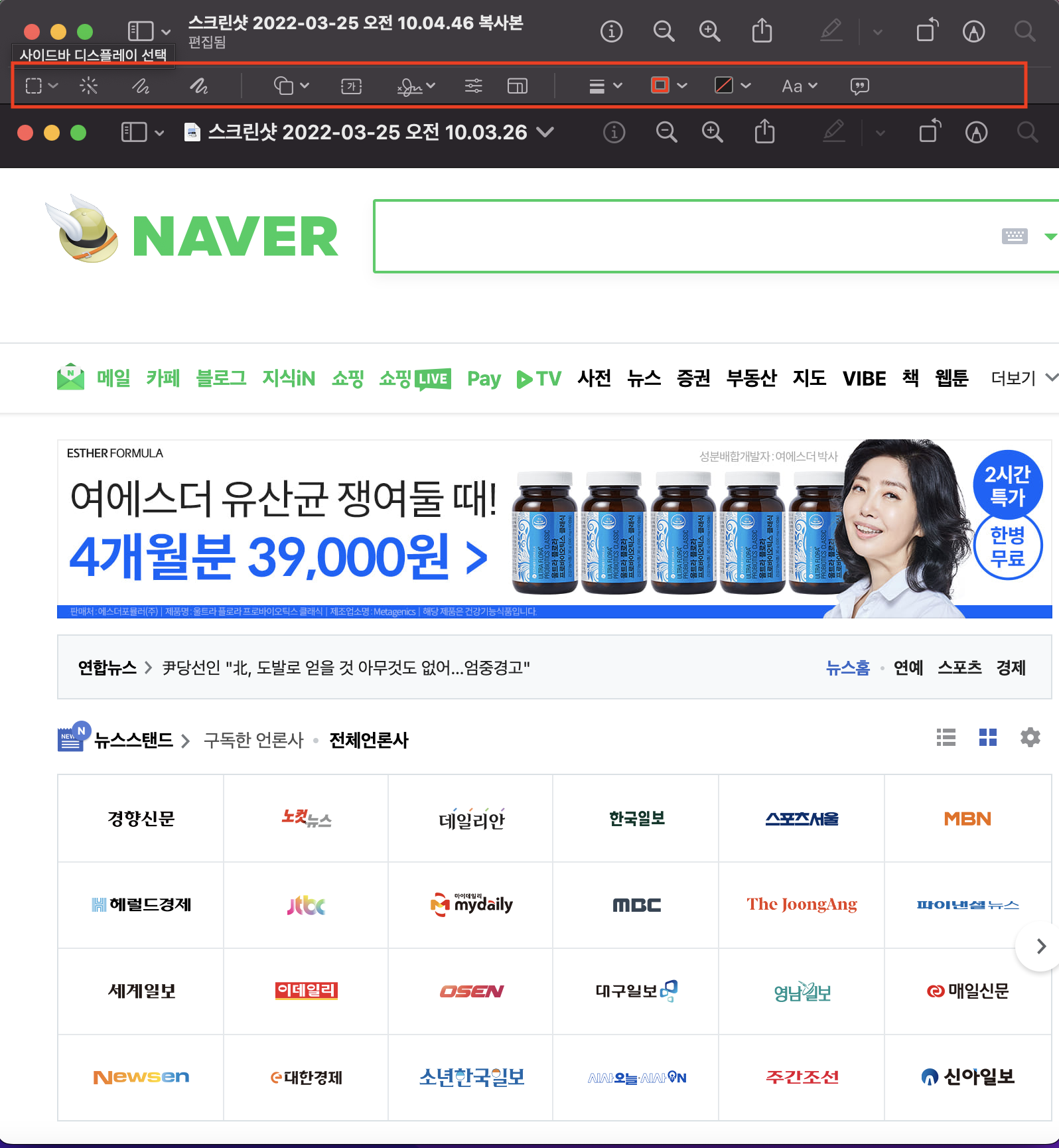 우선 나는 네이버 화면은 ⌘ + Shift + 4 커맨드 + 시프트 + 4 로 캡쳐했다
